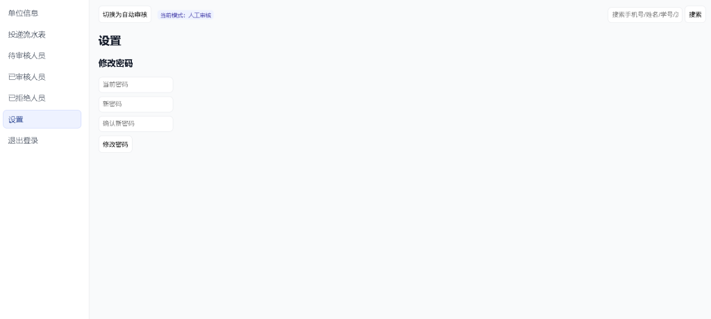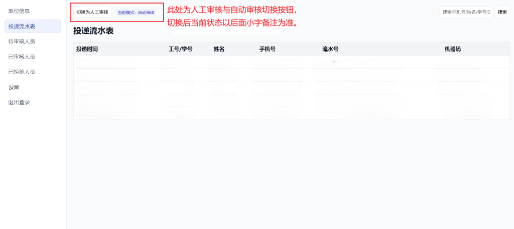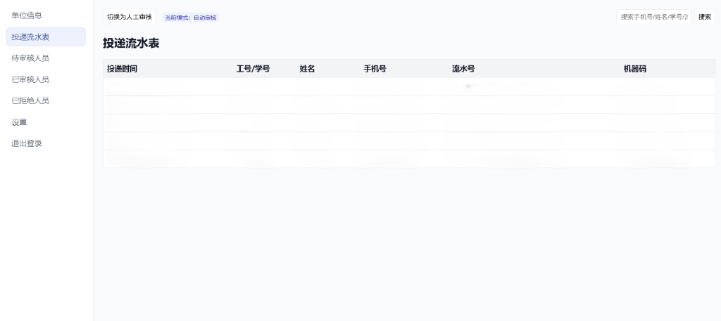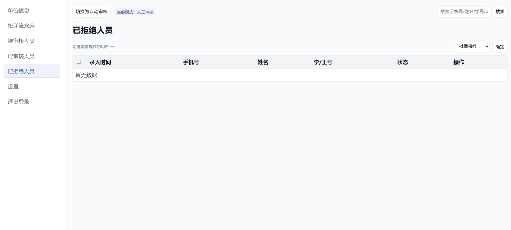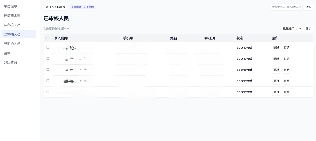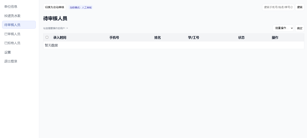 待审核人员项通常用于在人工审核状态下使用,当终端收单柜有新用户提交信息时,收单柜不会立即开启投递仓门。提交的信息则会出现在该项表单,由管理员在操作列选择通过或拒绝。只有操作列通过后,新用户再提交手机号投递仓门便会立即打开。